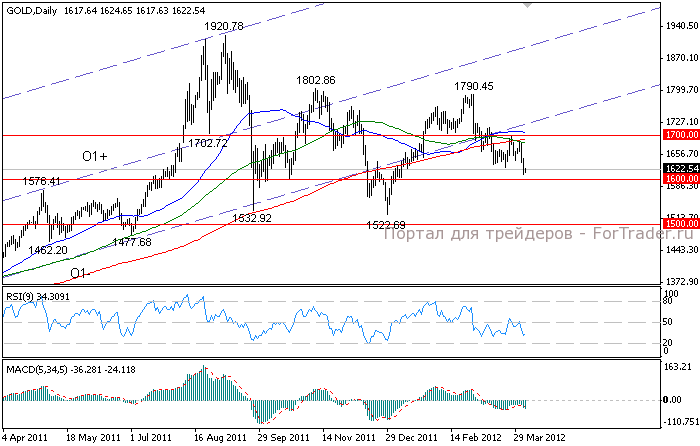 Техническая картина в золоте не изменилась. Металл продолжает снижение, начатое после того, как он не смог преодолеть сопротивление в районе 1685.00, где пересеклись 100- и 200-дневная SMA. Потенциальной целью данного тренда остается диапазон поддержек 1450.00-1520.00, а дополнительным подтверждением его развития станет прорыв ниже отметки 1600.00. Улучшение перспектив золота возможно только в случае прорыва и закрепления выше отметки 1700.00. Это откроет дорогу росту к сопротивлению 1800.00.