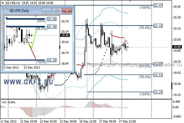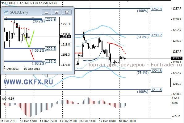 Цены на золото вчера снижались после неспособности дальнейшего роста. Золото мечется то вверх, то вниз, в ожидании заседания ФРС США. Уже сегодня вечером будет объявлено решение по поводу судьбы программы стимулирования американской экономики. Если ФРС все же решится на сокращения на этом заседании, то золото направится с ускорением вниз. Сегодня наблюдаем, а завтра торгуем. Традиционно делаю два варианта движения цены на неделю, основной красный и альтернативный зеленый. Значимые уровни на сегодня отмечены на часовом графике. Индикатор АО находится в отрицательной зоне и растет, указывая на коррекцию перед возможным продолжением снижения. Индикатор тренда указывает на снижение. Вне рынка.