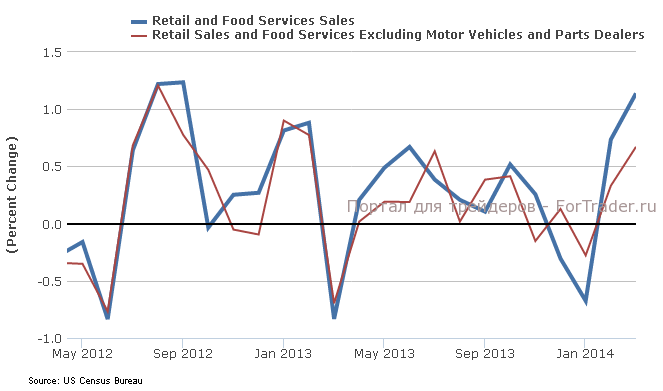 Розничные продажи в США в марте выросли на 1,1%, по сравнению с предыдущим месяцем, превысив ожидания роста на 0,8% м/м. Розничные продажи без учета продаж автомобилей поднялись на 0,7%, против прогноза роста на 0,5%. Ведущим фактором роста стало увеличение продаж автомобилей, которые подскочили в марте на 3,1%, после увеличения на 2,5% в феврале. В марте повысились продажи 10 из 13 основных категорий розничных товаров.
