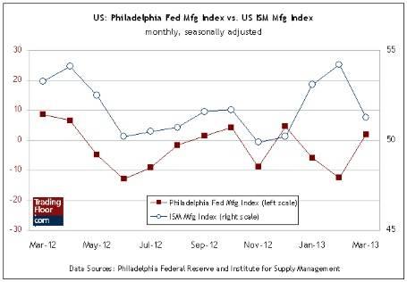 Сохранит ли производственный сектор в целом в США тенденцию к росту? Значительное ухудшение индекса  ISM не прибавляет оптимизма, хотя индексу все же удалось удержаться выше отметки 50, что означает, что производство по-прежнему растет. Правда, вышедший в понедельник отчет о производственной активности в штате Нью-Йорке заставляет игроков поумерить свой пыл. Напомним, что индекс Empire State в апреле зафиксировал более сильное, чем ожидалось падение. Если и индекс ФРБ Филадельфии преподнесет неприятный сюрприз, то это станет еще одним основанием полагать, что индекс ISM продолжит свое движение вниз в апреле.