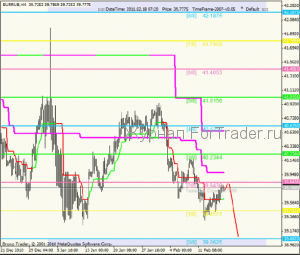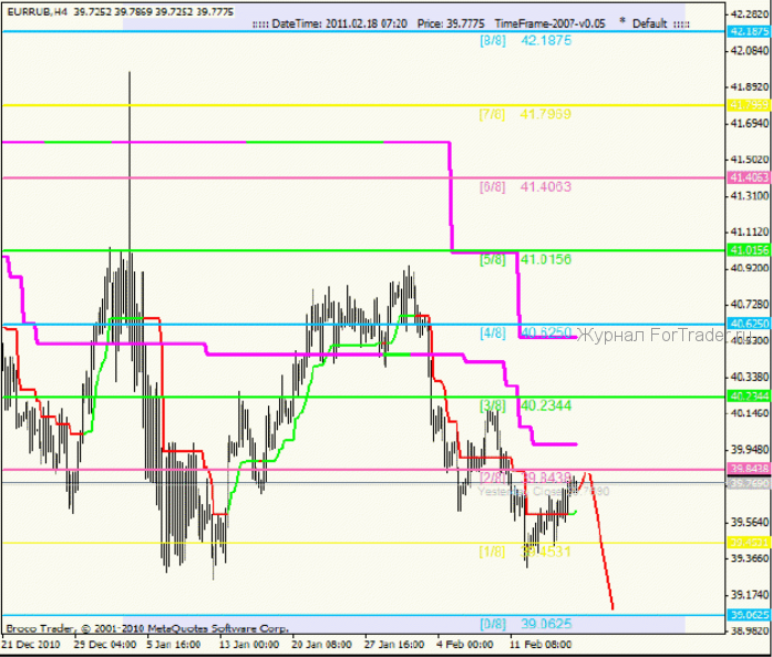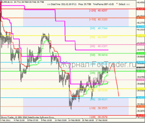 А если уровень [1/8], не мог проявлять свои особенные свойства, значит, он выступал как обычный уровень поддержки. А так как поддержка слабая, то перспектива развития восходящей коррекции не велика. Следовательно, стоит ждать ее окончания на ближайшем уровне сопротивления, таковым является уровень 39.8438[2/8]. После разворота цены на уровне 39.8438[2/8], нисходящий тренд продолжиться. На этот раз логично будет ожидать преодоления уровня 39.4531[1/8] и затем достижения основной цели на уровне 39.0625[0/8].