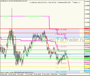 Целью теперь служит уровень 39.0625[0/8], основной уровень поддержки. Это очень сильный уровень, от него часто бывают восходящие коррекции и иногда даже происходят смены тенденции на противоположную. До уровня 39.0625[0/8], вероятность таких событий находиться на низком уровне, поэтому он и служит основной целью. Под уровнем [0/8], находиться зона перепроданности, область которая может оказывать поддержку. Поэтому, если на уровне [0/8], не происходит коррекция или разворот, это обязательно произойдет в зоне перепроданности.