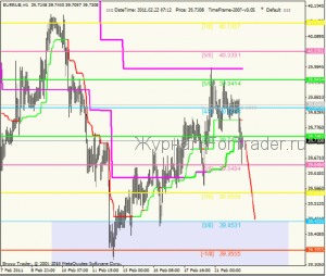 Четырехчасовой график EURRUB. От дневного СуперТренда произошел отскок вниз и цена снизилась. По этой части ожидания оправдались и восходящая коррекция, похоже окончена. Хочется отметить, что в данном случае цена пробила уровень 39.8438[4/8], а наиболее часто в таких ситуациях именно он останавливает коррекцию. Ведь это главный уровень поддержки/сопротивления, самый сильный уровень из всех. Он делит актуальную октаву напополам и обладает большими возможностями, в плане влияния на цену. Для тех кто торгует с подтверждением, стоит дождаться закрепления ниже СТ(Н4). Закрепление ниже трендовых индикаторов своевременно дают сигнал о смене тенденции.
