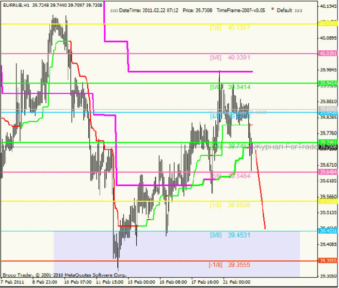 Часовой график EURRUB. От горизонтального участка СуперТренда произошел отскок вниз, на этом коррекция окончилась. Индикаторы СуперТренд могут оказывать поддержку/сопротивление, при этом по силе их можно сравнить с промежуточными уровнями [2/8] и [6/8]. Актуальная октава остается довольно узкой, что говорит о невысокой волотильности, которая вероятно сохраниться в ближайшее время. После достижения уровня 39.4531[0/8], возможна небольшая восходящая коррекция.