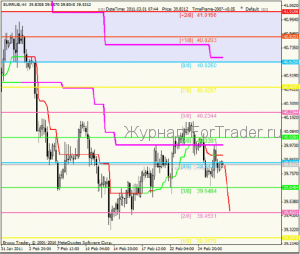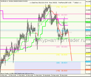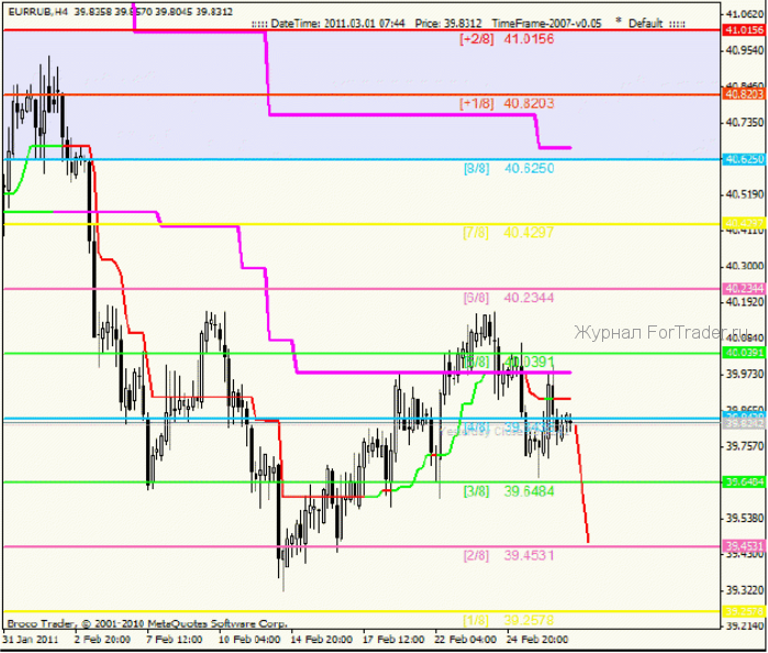 Четырехчасовой график EURRUB. Восходящая коррекция начавшаяся между уровней 39.2578[1/8] и 39.4531[3/8], окончена. Нисходящее движение снова в силе. Разворот вниз так же произошел между уровней, но это не имеет значение, так как в окончании коррекции самым важным моментом является закрепление за трендовым индикатором СТ(Н4). Это событие служит окончательным подтверждением разворота и восстановления тренда. В начале же коррекции важным является сам отскок от уровня. Если отскок происходит от сильного уровня, то коррекция имеет больший потенциал развития, и цена в большинстве случаев доходит до целевого уровня. В случаях же когда разворот на коррекцию происходит на слабом уровне или между уровней, она может завершиться в любой момент, еще до достижения значимого уровня поддержки/сопротивления.