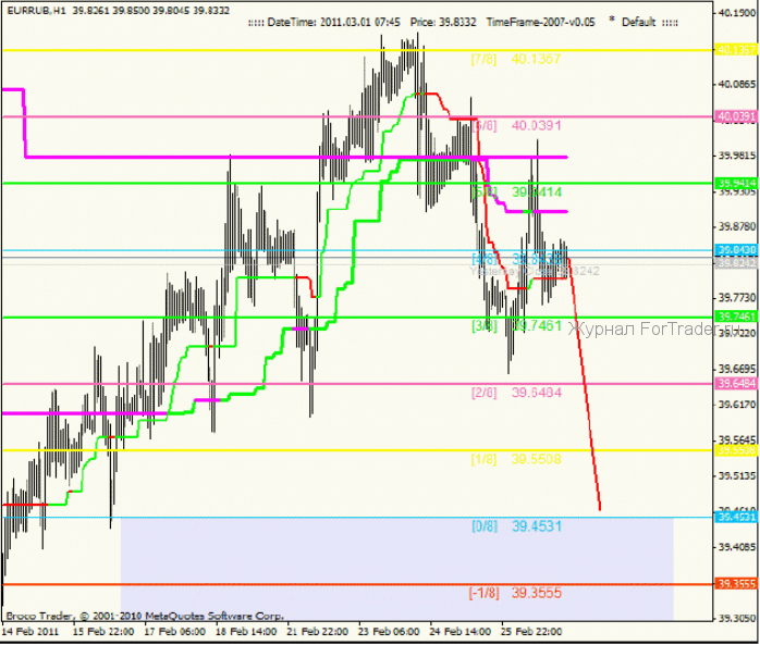 Часовой график EURRUB. Как видите после разворота на уровне 40.1367[7/8], цель была достигнута, более того, цена преодолела уровень 39.8438[4/8] вниз. После этого произошла восходящая коррекция, от уровня 39.6484[2/8], до недельного СуперТренда. На данный момент нисходящая тенденция восстановлена, и мы ждем новой волны снижения. Основная цель располагается на уровне 39.4531[0/8], снижение продолжиться и со временем этот уровень будет достигнут.