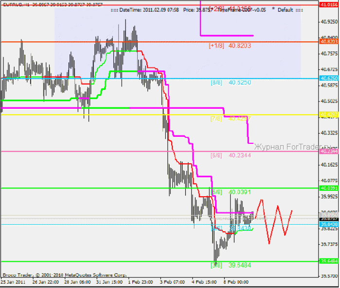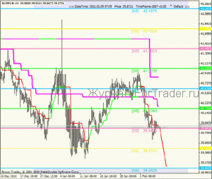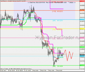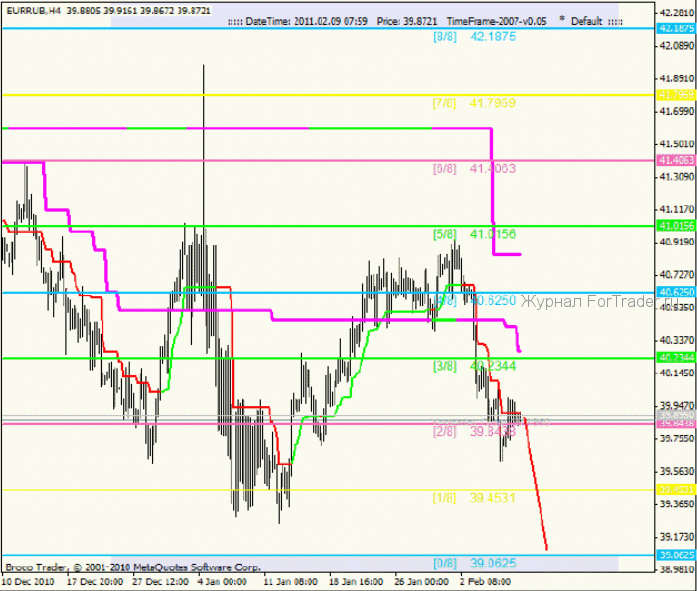 Четырехчасовой график EURRUB. Снижение цены продолжается, цель остается прежней. После преодоления уровня 39.8438[2/8], цена развернулась и началась локальная коррекция, в ее рамках цена даже преодолела уровень 39.8438[2/8] в обратную сторону. Хотя в данном случае это имеет мало значения, и сигналом разворота не является. Гораздо более значимым для нас, являлось преодоление уровня 39.8438[2/8] вниз. Потому что, преодоление промежуточной поддержки это сигнал продолжения движения. Уровень [2/8] не является таким сильным, как уровни [8/8], [0/8] и [4/8], но тем не менее обладает способностью оказывать поддержку. Если он достигается в ходе трендового движения, от него обычно случается локальная коррекция, если же цена приходит к уровню [2/8], в ходе развития коррекции, то он вполне может послужить местом ее окончания. Так например коррекции начавшиеся от уровня [0/8] или из зоны перепроданности, чаще всего оканчиваются на уровне [2/8].