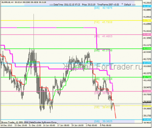 Часовой график EURRUB. Нисходящий тренд продолжился, цена преодолела не только уровень 39.6484[3/8], но и уровень 39.4531[2/8]. На данный момент развивается локальная восходящая коррекция, но так как она началась уже после преодоления уровня 39.4531[2/8] и разворот произошел между уровней, стоит ожидать ее окончания уже на ближайшем сопротивлении. Таковым является уровень 39.6484[3/8] и находящийся вблизи него четырехчасовой СуперТренд. Основная цель по-прежнему остается на уровне 39.0625[0/8].