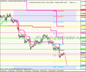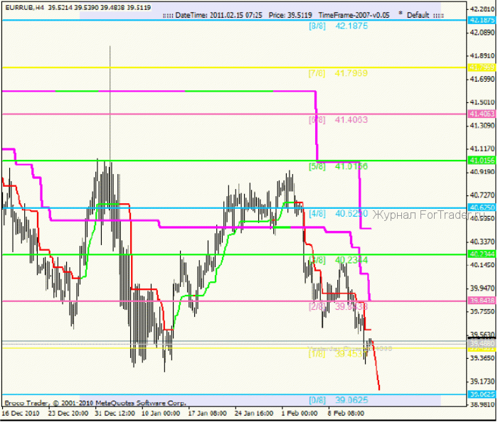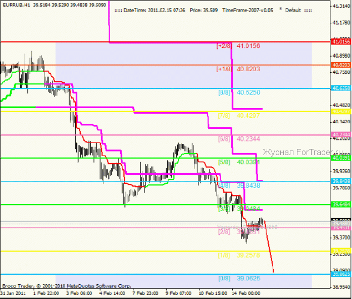 Четырехчасовой график EURRUB. Нисходящее движение оправдывает ожидания, снижение цены продолжается. Цена преодолела промежуточный уровень поддержки 39.8438[2/8] и сейчас находится на разворотном уровне 39.4531[1/8]. Как вы можете помнить, именно из-за этого уровня, произошла восходящая коррекция до уровня 40.6250[4/8]. На графике видно место разворота, цена длительное время тестировала уровень 39.4531[1/8], между ретестами происходили коррекции вплоть до уровня 39.8438[2/8], но в конце концов началось восходящее движение.