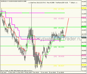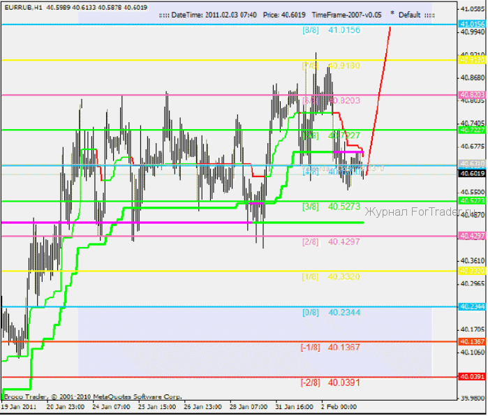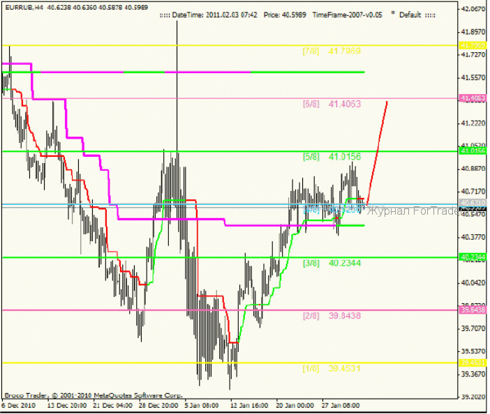 В данном случае, цена повторно тестирует главный уровень поддержки/сопротивления 40.6250[4/8]. Хотя конечно, в такой ситуации, когда на уровне [4/8], происходила консолидация, закрепление за ним не будет отличаться большой надежностью. Однако это единственный сигнал, который сейчас дает цена. Гораздо более интересным и надежным сигналом послужило бы закрепление выше уровня 41.0156[5/8] или ниже 40.2344[3/8]. Это дало бы окончательную уверенность, в направлении движения цены.