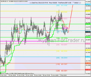Часовой график EURUSD. От уровня 40.6250[4/8], уже начинался подъем, но после отскока от разворотного уровня 40.9180[7/8], цена вернулась обратно к этому уровню. Вообще, как уже не однократно было описано в наших публикациях, у уровней [1/8] и [7/8], есть одно очень важное свойство. Если на них происходит остановка, в ходе стремительного движения, это говорит о том, что цена развернется и целью станет уровень [4/8]. В данном случае оправдалось именно это свойство. Сейчас цена находиться у сильного уровня поддержки 40.6250[4/8], ожидаем разворота вверх и затем еще одной волны подъема.