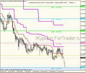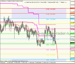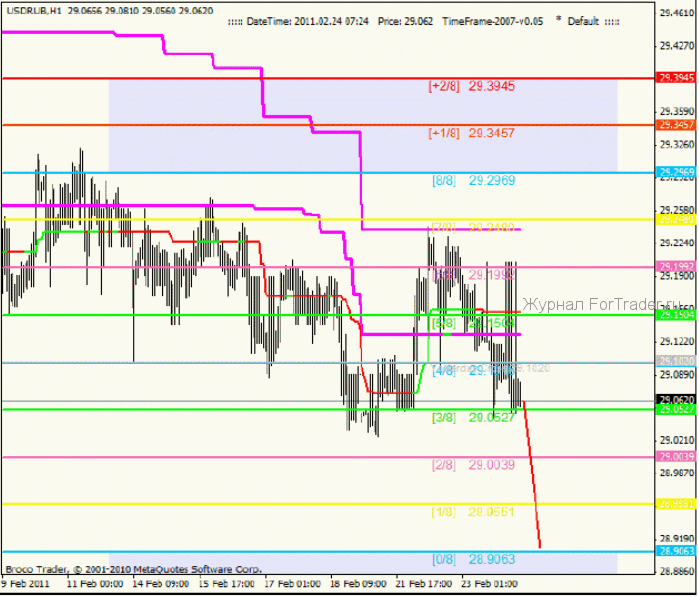Четырехчасовой график USDRUB. Цена все еще находиться у уровня 29.1016[1/8], закрепления выше СТ(D1) не происходит, а значит приоритет носит вариант со снижением до основного уровня поддержки 29.9063[0/8]. Это сильный уровень и в случае его достижения, скорее всего произойдет восходящая коррекция. При первом достижении таких уровней как [4/8], [0/8], [8/8], от них обычно происходит отскок и коррекция. Ниже уровня 28.9063[0/8], находиться зона перепроданности, поэтому даже если цена пробьет уровень [0/8] вниз, вероятность коррекции останется на очень высоком уровне. Зона перепроданности, это область, которая оказывает поддержку.