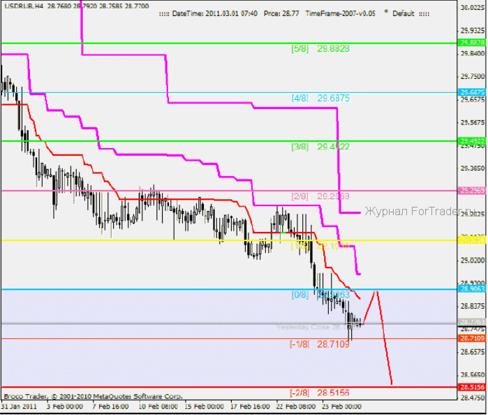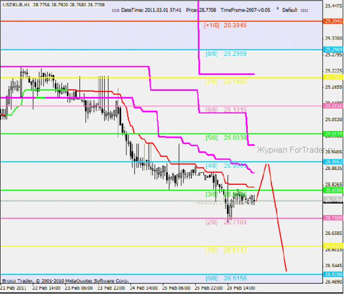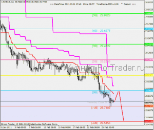 Так же хотелось бы отметить уровень 28.7109[-1/8], у него есть одно свойство. Если цена достигает этого уровня в первый раз, от него происходит отскок, за которым следует возврат к уровню [0/8]. Именно этого мы сейчас и ждем, далее от уровня [0/8], вероятно последует отскок и затем новая волна снижения. Логической целью в зоне перепроданности служит уровень 28.5156[-2/8], при его пробое происходит пересчет актуальной октавы и перерисовка уровней Мюррея.