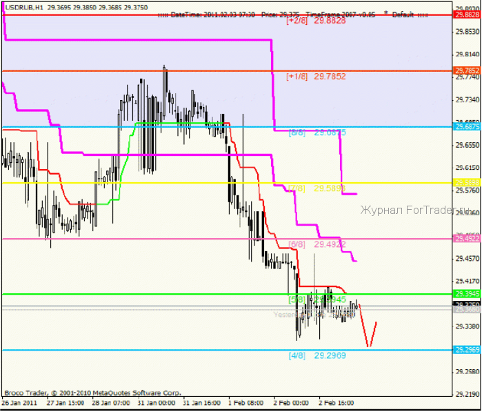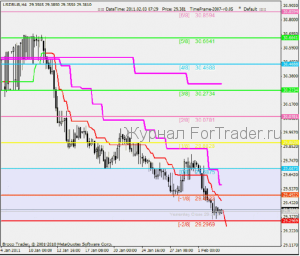 Часовой график USDRUB. Со вчерашнего дня уровни Мюррея перерисовались, но сути это не изменило, на отметке 29.2969, остался сильный уровень [4/8]. Нисходящий тренд продолжается и со временем стоит ожидать достижения этой отметки. Т.к. это сильный уровень поддержки, от него высока вероятность развития коррекции. Коррекция может продолжиться до уровня 29.4922[6/8]. В случае же преодоления уровня 29.2969[4/8], без коррекции, что мало вероятно, может начаться боковое движение в канале.