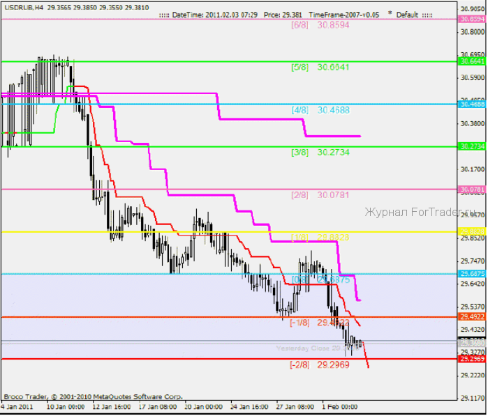 Четырехчасовой график USDRUB. Снижение продолжилось, как и ожидалось. Несмотря на то, что цена находиться в зоне перепроданности, нисходящий тренд по-прежнему остается в силе. На данный момент, цена уже совсем близко подошла к уровню 29.2969[-2/8], ограничивающему зону перекупленности снизу. При пробое этого уровня, происходит пересчет актуальной октавы и перерисовка уровней Мюррея. Именно поэтому данный уровень служит логической целью.
