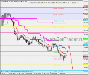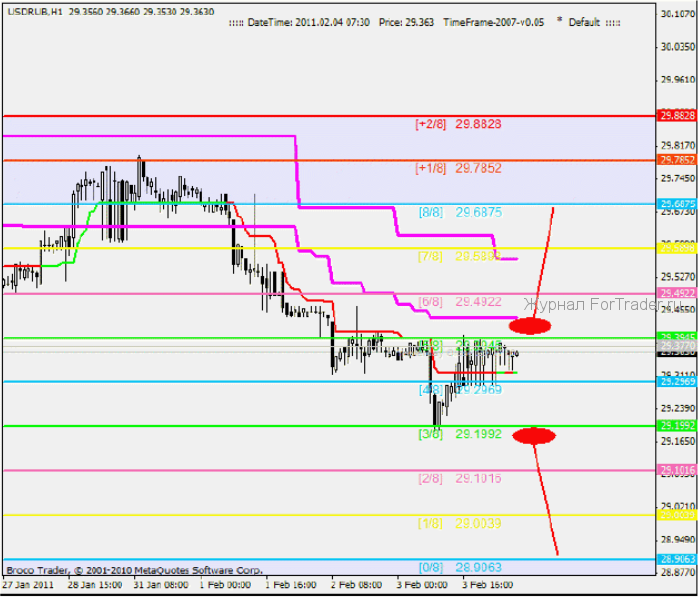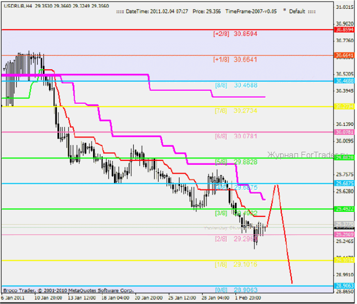 Четырехчасовой график USDRUB. Цена пробила уровень [-2/8], и уровни Мюррея перерисовались. Как вы можете помнить, еще вчера цена находилась в зоне перепроданности, и ее логической целью был уровень 29.2969. Пробой уровня [-2/8], предполагает продолжение установившейся тенденции, для нас это продолжение нисходящего тренда. Нисходящий тренд уже давно доминирует на рынке, и после преодоления уровня 29.6875[4/8] вниз, открылись новые перспективы его развития. Уровень 29.6875[4/8], выступал серьезным потенциальным местом разворота. На нем была значительная вероятность смены тенденции на восходящую. Но так как разворота не произошло и цена преодолела такую сильную поддержку, есть основания предполагать, что Down-тренд продолжиться еще некоторое время.