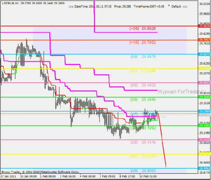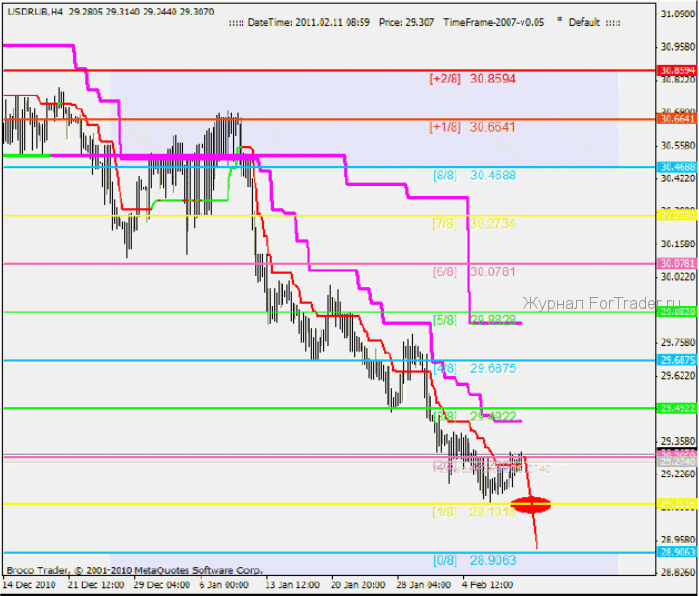 Часовой график USDRUB. Доминирует нисходящий тренд, но на данный момент развивается восходящая коррекция. От промежуточного уровня поддержки 29.1016[2/8], произошел отскок и затем в ходе коррекции, цена выросла до главного уровня поддержки/сопротивления 29.2969[4/8]. Как следует из названия, это очень сильный уровень, степень его влияния на цену велика. Если смотреть только на данный график, на текущих позициях стоит ждать разворота и затем продолжения снижения.