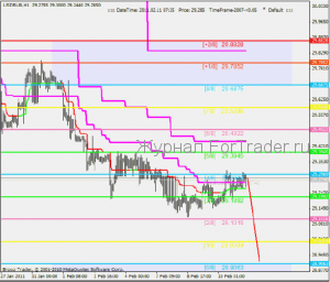 Сейчас цена находиться у уровня 29.2969[2/8], здесь стоит ждать разворота вниз и затем дальнейшего снижения. После достижения уровня 29.1016[1/8], все решит реакция на этот уровень. Если цена и на этот раз не сможет его преодолеть, произойдет разворот и целью станет уровень 29.6875[4/8].