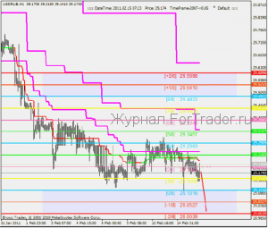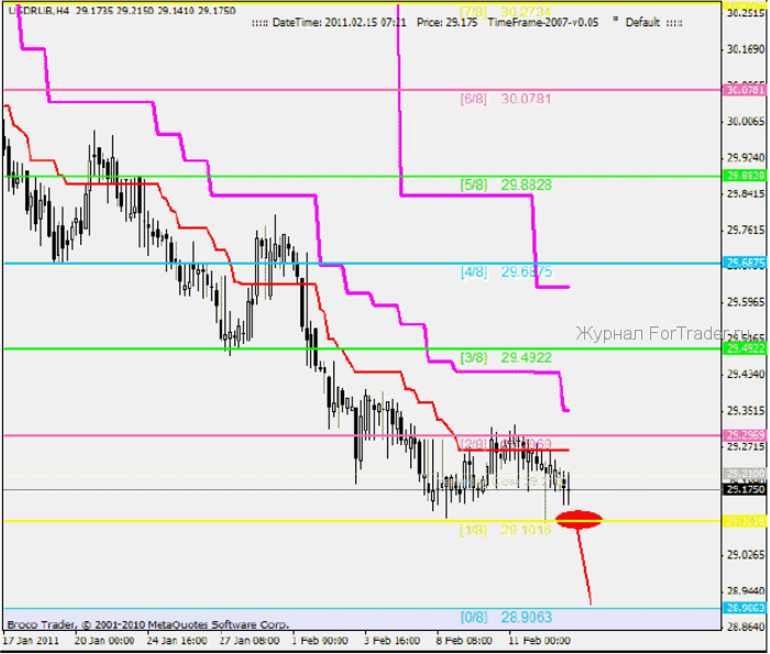 Четырехчасовой график USDRUB. Цена повторно подходит к разворотному уровню 29.1016[1/8], на первом подходе от него произошел отскок. Для того, кто разбирается в уровнях Мюррея, это событие о многом говорит. Разворот на уровне [1/8], является прогностически ценным событием, обычно он влечет за собой серьезное изменение цены. Так, если разворот на уровне [1/8], подтверждается, целью становиться главный уровень поддержки/сопротивления 29.6875[4/8]. Под разворотом на уровне [1/8], следует понимать не просто отскок, а два или три неудачных тестирования этого уровня. Именно так обычно происходит разворот. После первичного отскока следует подъем до уровня [2/8], затем отскок и новое тестирование уровня [1/8].