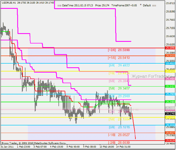 Часовой график USDRUB. После разворота на уровне 29.1504[1/8], произошла коррекция до главного уровня поддержки/сопротивления 29.2969[4/8]. В данном случае, можно отметить повышенную волотильность и довольно узкие уровни. Тем не менее сценарий оправдался и уровень 29.2969[4/8], был достигнут. Далее нисходящий тренд будет развиваться обычными темпами. Следующим важным этапом станет преодоление уровня 29.1016[0/8] и вход в зону перепроданности. В ней возможны восходящие коррекции, но со временем стоит ждать и ее преодоления.