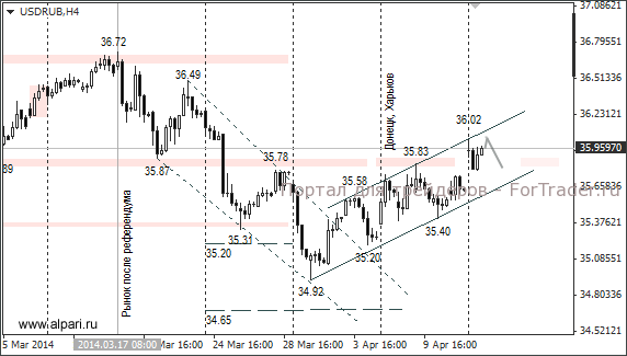 Новый виток напряжённости на Украине негативно отразился на российском рубле с открытия торговой сессии. Напоминаем, что в 10:00 мск истекал срок ультиматума объявленного и. о. президента Украины Александром Турчиновым, который совпал с открытием рынка. За считанные минуты курсы доллара и евро достигли максимумов 36,03 и 49,87 соответственно. После истечения срока ультиматума новые власти воздержались от силовых акций по подавлению протестов, что положительно сказалось на рубле. До закрытия торговой сессии рубль по отношению к евро и доллару находился в коррекционной фазе.