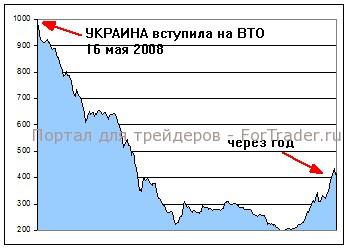 Хуже всего пришлось Украине. Она вступила в ВТО буквально накануне мирового кризиса- 16 мая 2008. На график ее фондового индекса за тот год до сих пор без слез не взглянешь.