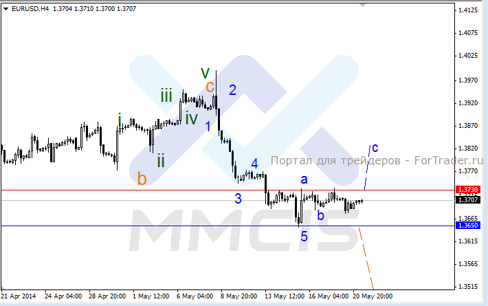 Основной сценарий предполагает рост котировки в случае пробоя отметки 1.3730, после чего восходящее ралли будет проходить в рамках волны «с» к уровню 1.3800. В качестве альтернативного сценария рассматривается пробой локального уровня поддержки 1.3650, после чего падение продолжится.
