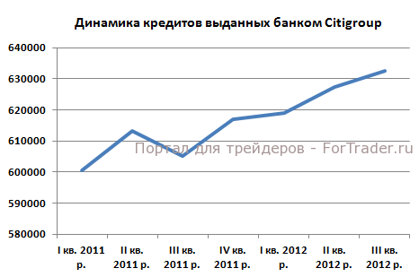 Отдельно выделим рост суммы выданных банком кредитов: показатель демонстрирует рост уже 4-й квартал подряд. По итогам III кв. 2012 показатель вырос на 4,51% до $632,507 млрд. по сравнению с аналогичным периодом прошлого года. В I и II кв. 2012 сумма выданных кредитов выросла на 3,07% и 2,32% в годовом выражении, соответственно.