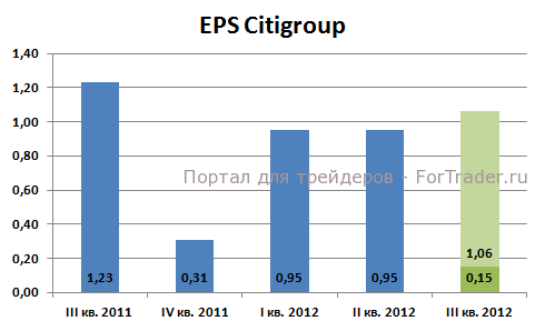В понедельник, 15 октября, Citigroup опубликовал свою финансовую отчетность за III квартал 2012 года. Из положительных составляющих корпоративной отчетности стоит выделить динамику прибыли на акцию (EPS). Так, по итогам III кв. 2012 EPS составляет $0,15 на акцию. Однако, без учета разовых факторов, данный показатель составил $1,06 на акцию, тем самым, превзойдя прогноз на уровне $0,93 на акцию и превысив результаты за I и II кв.2012 г.