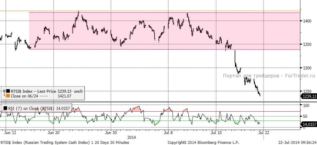 Санкции толкают российские индексы вниз. Особенно уязвимо себя чувствует долларовый индекс RTS, на который также давит снижение курса российского рубля. Мы считаем, что после такого сильного снижения высока вероятность отскока к уровню 1280 пунктов. Дальнейший ход событий будет определён введением (или не введением) новых санкций, которые будут обсуждаться сегодня в Брюсселе, а также новостями с заседания Совета безопасности России.
