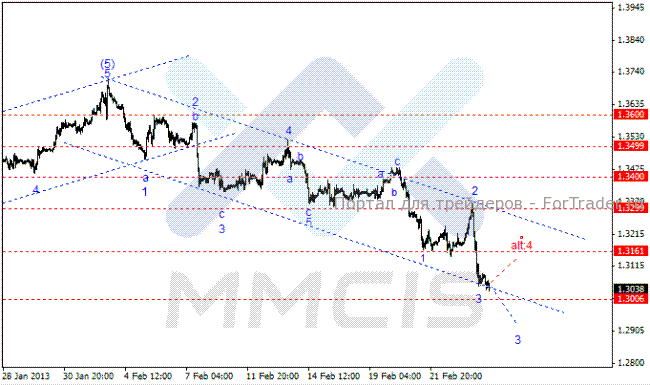 Что же касается перспектив валютной пары евро/доллар, по мнению технических аналитиков, она может сохранить нисходящую тенденцию после пробоя уровня поддержки 1.3020. Поэтому сегодня в качестве основного сценария можно рассматривать дальнейшее движение пары вниз, в район 29-й фигуры, в виде удлиненной волны «3». В то же время нельзя исключать и альтернативного сценария, согласно которому волна «3» завершилась и пара евро/доллар будет укрепляться в виде фигуры «Alt:4».