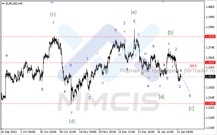 Поэтому в качестве основного сценария рассматривается вариант завершения волны «4» и возобновления снижения котировок в рамках волны «5» нисходящего импульса «[с]» старшего порядка. Альтернативный сценарий предполагает продолжение роста котировок в рамках коррекционной волны «Alt:4», целевым уровнем которой может выступить отметка 1.3575.