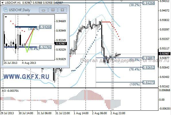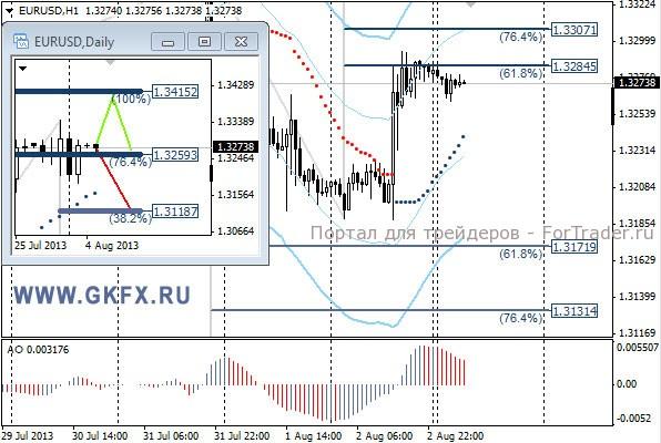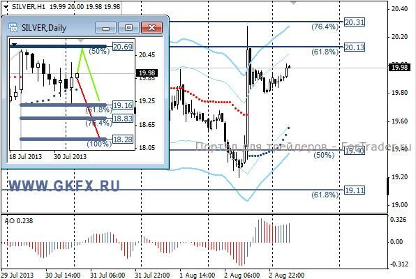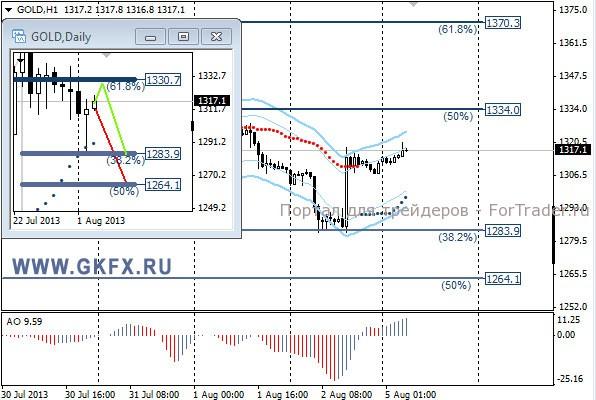 Цены на золото еще до публикации данных по США снижались, выполнив первую цель на уровне 1295,0. Однако позднее после публикации данных по США цены на золото вернулись к 1314,0, закрыв продажи по безубытку. Тем не менее, на этой неделе снижение может возобновиться, потому что сокращение QE3 неизбежно приближается, а для золота это негативный фактор. На дневном графике отработал красный вариант. Традиционно делаю два варианта движения цены на неделю, основной красный и альтернативный зеленый. Значимые уровни на сегодня отмечены на часовом графике. Индикатор АО находится в положительной зоне и растет, указывая на желание инструмента двигаться вверх в данное время. Индикатор тренда указывает на рост. Сегодня смотрим за намерением рынка.
