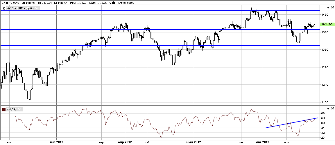 Судя по графику «широкого индекса» S&P500, можно судить об осторожности инвесторов. Рассчитывать на появление тенденции можно будет при уверенном пробитии ключевых уровней. Сопротивление находится на отметке 1465 п., а поддержка  — на 1345 п. Индекс относительной силы RSI находится на уровне сопротивления, поэтому негативное развитие более ожидаемо. До конца года, с большой долей вероятности, цена останется в пределах диапазона 1345 – 1465 п.