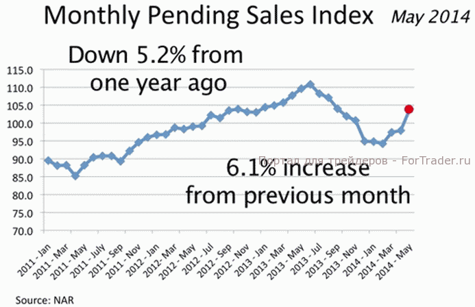 Между тем данные по рынку жилья вышли лучше прогнозов. Число незавершенных сделок по продаже жилья, согласно данным Национальной ассоциации риэлторов (NAR), выросло в мае на 6,1% м/м, значительно превысив ожидания роста на 1,5%. Месячные темпы роста стали максимальными с апреля 2010 года. Индекс незавершенных продаж на вторичном рынке жилья вырос в мае до 103,9, с 97,9 в апреле. Продажи растут уже третий месяц подряд. Рынок жилья начинает набирать обороты, чему способствует снижение процентных ставок по ипотеке и рост предложения на рынке.