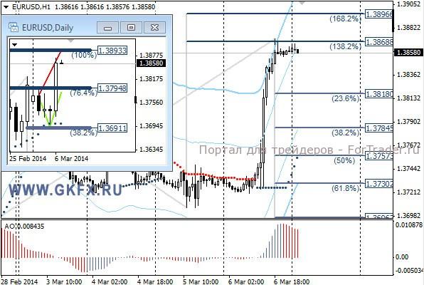 Пара EURUSD торговалась с повышением, после того как участники рынка получили подтверждение от ЕЦБ о неизменной денежно-кредитной политике. Как я писал вчера, данные по США заложили хороший фундамент для роста пары, что мы и увидели. По рекомендации сделка на покупку исполнилась по 1,3750, и все цели были достигнуты. Сегодня основное событие дня это данные по рынку труда США. На эту неделю традиционно рассматриваю два варианта возможного движения цены, основной красный и альтернативный зеленый. Значимые уровни на сегодня отмечены на часовом графике. Индикатор АО находится в положительной зоне и снижается, указывая на коррекцию перед возможным продолжением роста. Индикатор тренда указывает на рост. Под сегодняшние данные по США рекомендаций не даю.