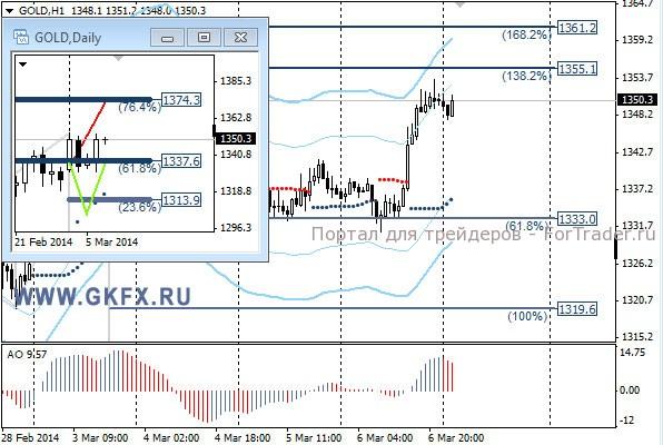 Цены на золото оправдали ожидания и поднимались в цене, достигнув первой цели по рекомендации на уровне 1348,0. Стоп на уровне 1330,0 удержался, и после достижения ценой первой цели его можно было перевести на уровень безубытка. Сегодня основное событие дня это данные по рынку труда США и под эти данные оставлять сделку нежелательно. Однако есть веские основания для этого, так как данные по рынку труда в США, вероятно, окажутся слабыми, тогда золото может продолжить рост. Традиционно делаю два варианта движения цены на неделю, основной красный и альтернативный зеленый. Значимые уровни на сегодня отмечены на часовом графике. Индикатор АО находится в положительной зоне и снижается, указывая на коррекцию перед возможным продолжением роста. Индикатор тренда указывает на рост. Держим покупки от 1341,0 с целями 1354,0 и 1360,0.