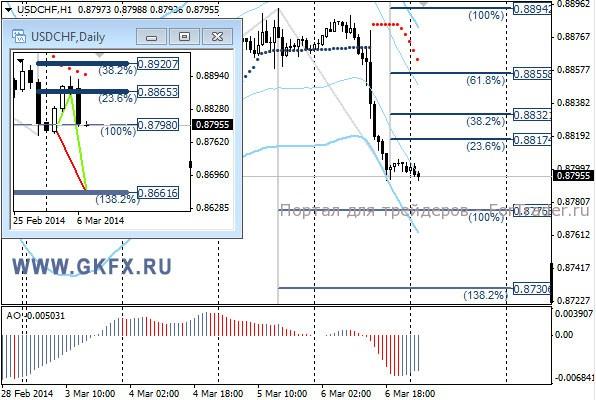 Пара USDCHF исполнила сделку по рекомендации на продажу. На мелких графиках можно было войти по 0,8847. Две цели были достигнуты, и стоп можно было перевести на уровень безубытка. Сегодня сделку можно оставить наудачу до третьей цели на уровне 0,8775, или закрыть по рынку как есть. На эту неделю традиционно рассматриваю два варианта возможного движения цены, основной красный и альтернативный зеленый. Значимые уровни на сегодня отмечены на часовом графике. Индикатор АО находится в отрицательной зоне и растет, указывая на коррекцию перед возможным продолжением снижения. Индикатор тренда указывает на снижение. Под сегодняшние данные по США рекомендаций не даю.