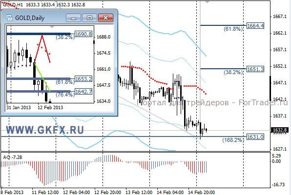 Цены на золото последовали за евро и снизились, не дав возможности забрать прибыль по рекомендации. Цена не много не дошла до цели. Возможность поставить безубыток была, поэтому он и сработал. Понижательная динамика имела подтверждение. Сейчас лучше рассматривать сделки на продаже от откатов. На дневном графике видно, что цены подходят к поддержке 1625,00, прохождение которой откроет дорогу к дальнейшему снижению. На дневном графике традиционно делаю два варианта движения цены на неделю, основной красный и альтернативный зеленый, склоняюсь к красному. Значимые уровни на сегодня отмечены на часовом графике. Индикатор АО в отрицательной зоне и снижается, указывая желание цены двигаться вниз. Индикатор тренда указывает на снижение. Нет безопасного входа, вне рынка.
