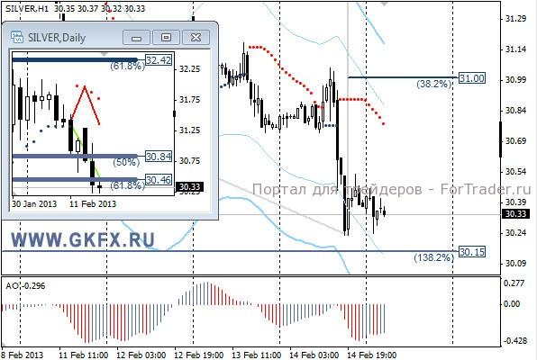 Цены на серебро повторяли динамику золота и снизились, преодолев поддержку, сформированную накануне, и обозначила понижательную конструкцию. В данный момент цель для движения вниз 29,20-29,50. По вчерашней рекомендации цена не дошла до цели несколько пунктов, и в итоге сработал безубыток. На дневном графике делаю два варианта движения цены на неделю, основной красный и альтернативный зеленый, склоняюсь к красному. Значимые уровни на сегодня отмечены на часовом графике. . Индикатор АО в отрицательной зоне и снижается, указывая желание цены двигаться вниз. Индикатор тренда указывает на снижение. Нет безопасного входа, вне рынка.
