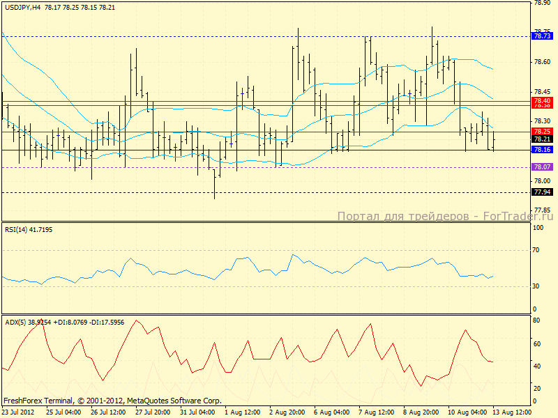4х-часовой график: более мелкий график (Н1) уже сформировал разворотную комбинацию, однак давление на пару традиционно сохранено. Отсюда два пути: рост с текущих уровней (78.16) в направлении средней 78.40 и 78.73, либо новое углубление к 78.07 и 77.94, откуда почти наверняка произойдет северное перестроение.