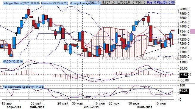 Индикатор Ишимоку отражает наличие среднесрочного повышательного тренда, при этом наблюдается стадия смены, так как ключевые средние индикатора, образовавшие проторгованную область на 7300 пунктов, торгуются разнонаправлено: быстрая – повышательно, медленная – горизонтально – признак становления тренда. Важный уровень сопротивления расположен на 7600 пунктов.
