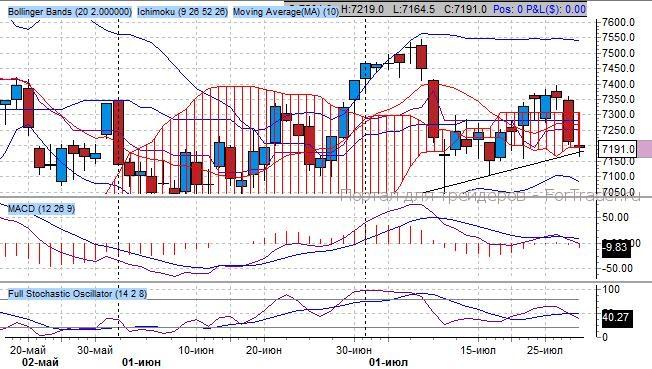 Индикатор Ишимоку отражает наличие среднесрочного понижательного тренда, при этом наблюдается стадия завершения, так как ключевые средние индикатора, образовавшие проторгованную область на 7300 пунктов, торгуются синхронно: быстрая – горизонтально, медленная – горизонтально – признак будущей смены тренда. Важный уровень сопротивления расположен на 7600 пунктов, уровень поддержки – на 7100 пунктов.
