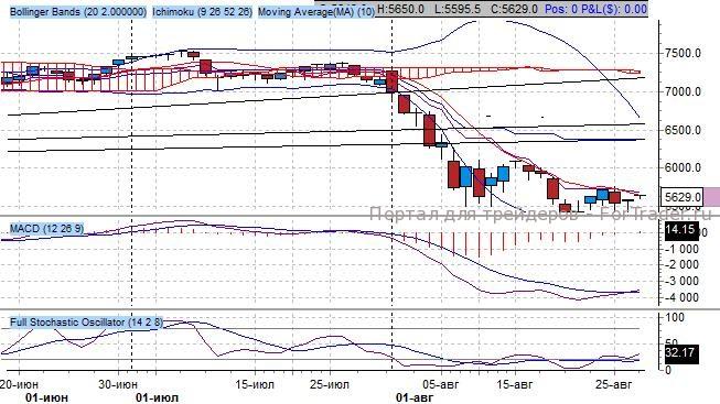 Индикатор Ишимоку отражает образование среднесрочного повышательного тренда, так как ключевые средние индикатора торгуются синхронно: быстрая – горизонтально, медленная – понижательно – признак становления тренда. Важный уровень сопротивления расположен на 6500 пунктов, уровень поддержки – на 5400 пунктов.