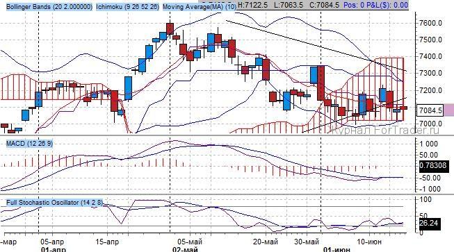 Индикатор Ишимоку отражает наличие среднесрочного повышательного тренда, при этом наблюдается начальная стадия, так как ключевые средние индикатора, образовавшие проторгованную область на 7100 пунктов, торгуются синхронно: быстрая – горизонтально, медленная – горизонтально. Важный уровень сопротивления расположен на 7400 пунктов.