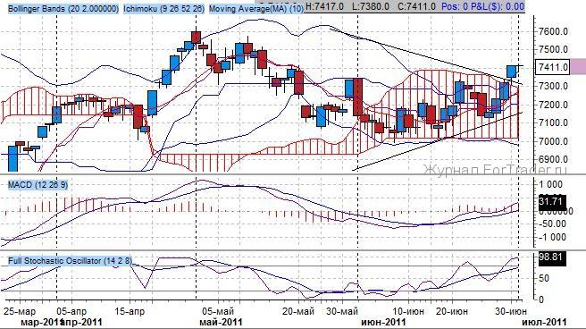 Отмечаем выход котировок из формации «треугольник» через верхнюю границу, расположенную на уровне 7300 пунктов. Важный графический уровень поддержки проходит через уровень 6600 пунктов, а ранее через уровень 7150 пунктов. Уровень 7400 был первоочередным ориентиром при возврате на рынок «быков». Текущая комбинация японских свеч – «бычья контратака» от 27 и 28 июня реализует свой повышательный потенциал.