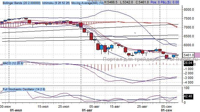 Индикатор Ишимоку отражает наличие среднесрочного понижательного тренда, так как ключевые средние индикатора торгуются синхронно: быстрая – горизонтально, медленная – горизонтально – признак смены тренда. Важный уровень сопротивления расположен на 6100 пунктов, уровень поддержки – на 5200 пунктов.