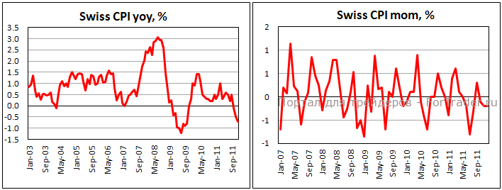Несмотря на заверения главы НБШ Хильдебранда, что это временно, дефляция в Швейцарии продолжает углубляться. Согласно опубликованным сегодня данным, потребительские цены упали в декабре еще на 0,2%, что стало седьмым снижением за последние семь месяцев. Во втором полугодии годовой темп падения цен составлял 2,4%, что просто обязано вызвать тревогу у швейцарских политиков. На квартальном заседании в прошлом месяце НБШ упустил возможность поднять целевой уровень с 1,2 по EUR/CHF, несмотря на настойчивые мольбы экспортеров, которые утверждают, что валюта остается крайне переоцененной. В эти дни перед НБШ стоит нелегкая задача: в наши дни евро трудно назвать устойчивой валютой, а сохранение обязательств неограниченных покупок единой валюты повышает риск подрыва доверия к банку, не говоря уже о «акционерах» НБШ. Кроме того, похоже, что экономика стоит перед рецессией в этом году и разгорающейся дефляцией. Как предположил Хильдебранд в прошлом месяце, НБШ продолжает работу в «непрерывном кризисном режиме». И делает он это уже более четырех лет.