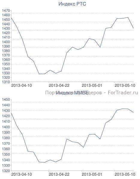 Закрытие  пятницы  прошло  на минимальных  отметках  и  тем  самым дало  первый  намёк  на  разворотный  паттерн  на дневном  таймфрейме. После  подобного  закрытия дня можно почти с уверенностью сказать, что инициативу в свои руки начинают брать медведи и теперь на любых локальных отскоках можно пробовать открывать короткие позиции с прицелом 2-3 недели. Вновь обозначился важный технический диапазон 1440-1450 который будет в дальнейшем выступать  сильным  сопротивлением.  Уровней  поддержки  по  пути  вниз  по  индексу  ММВБ  много, поэтому  говорить  о  скорости  движения  сейчас  довольно  сложно.  В  любом  случае,  дальнейшую среднесрочную торговлю мы рекомендуем строить на коротких позициях, делая ставку на снижение рынка.
