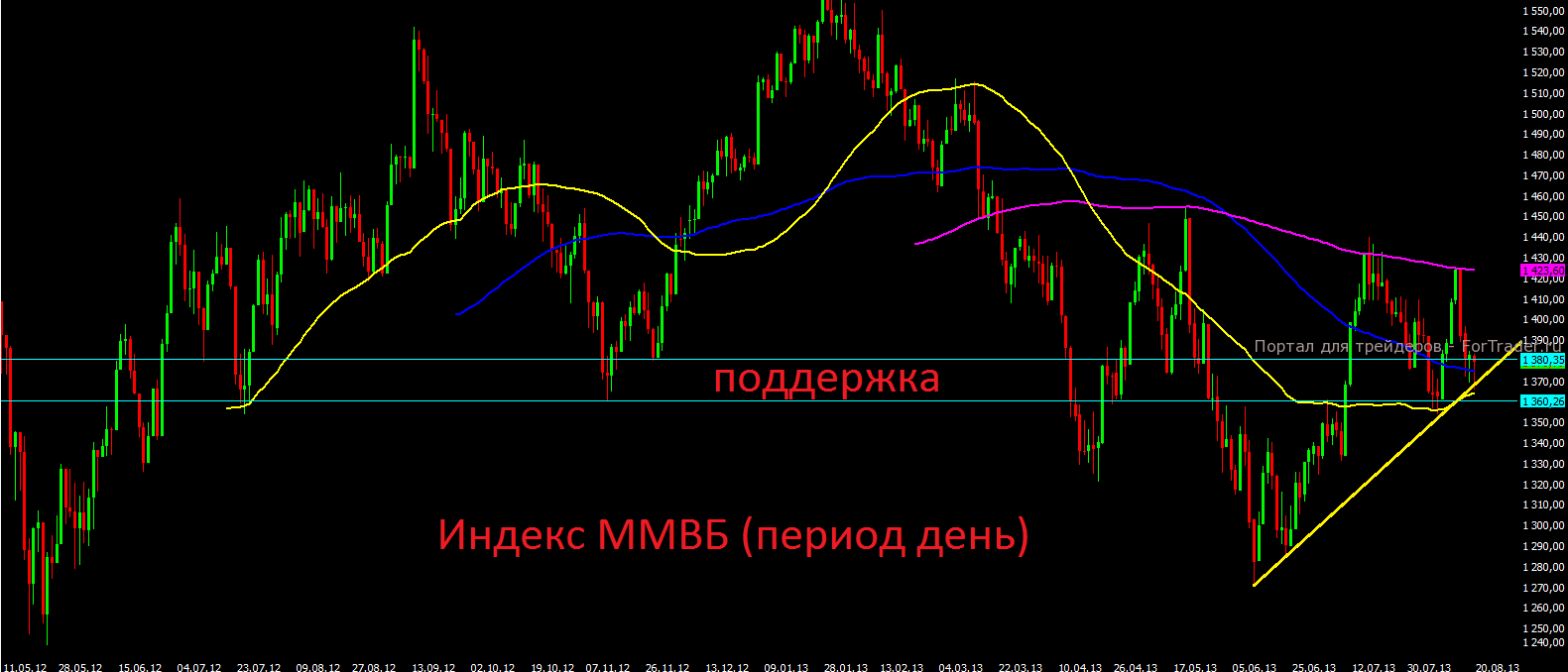 По итогам вторника вновь российский индекс ММВБ отделался небольшими потерями в пределах 0.3% и смог удержать важный технический диапазон 1360-1380 пунктов, пробой которого вниз, откроет дальнейшую дорогу для существенного снижения. Столь несущественное снижение российских площадок на фоне серьёзной двухдневной распродажи в Азии и  падения всех европейских индексов говорит о локальной силе российского рынка, поэтому делать ставку на снижение рынка и открывать короткие позиции сейчас не время, для этого стоит дождаться выхода вниз и пробоя отметки 1350 пунктов по индексу ММВБ.